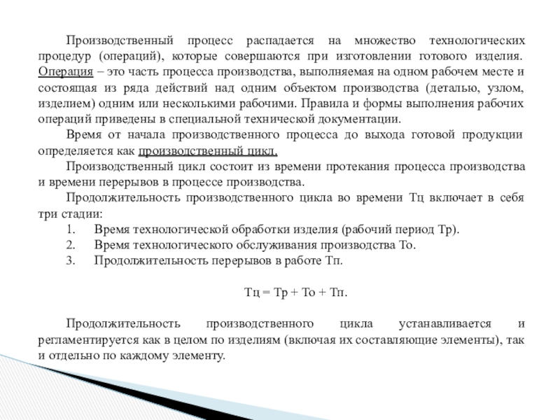 Производственный цикл состоит из времени протекания процесса производства и времени перерывов в процессе производства.