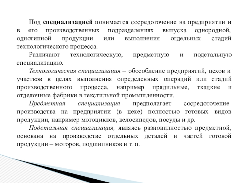 Слайд 13Под специализацией понимается сосредоточение на предприятии и в его производственных подразделениях