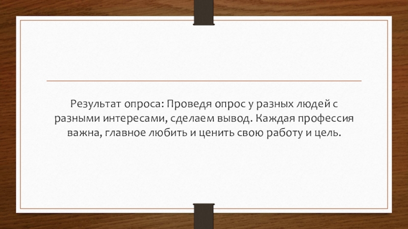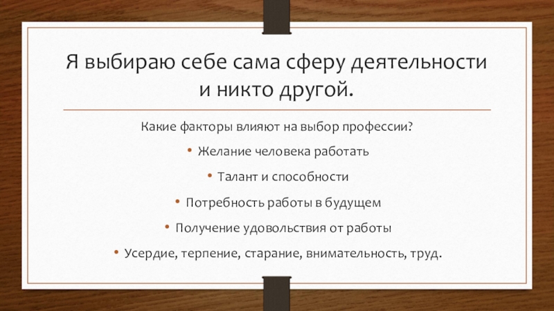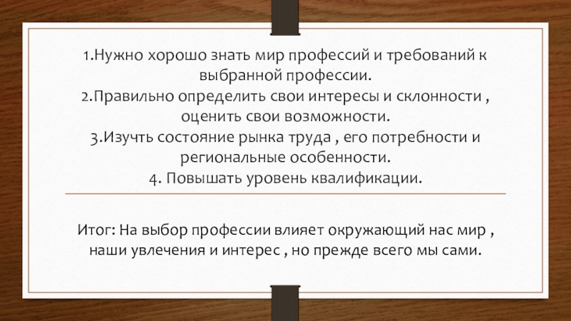 Итог: На выбор профессии влияет окружающий нас мир , наши увлечения и интерес , но прежде всего мы сами.