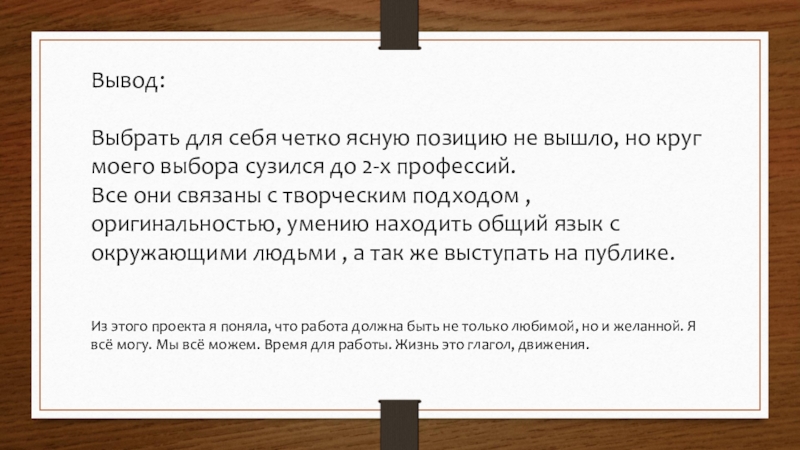 Из этого проекта я поняла, что работа должна быть не только любимой, но и желанной. Я всё могу. Мы всё можем. Время для работы. Жизнь это глагол, движения.