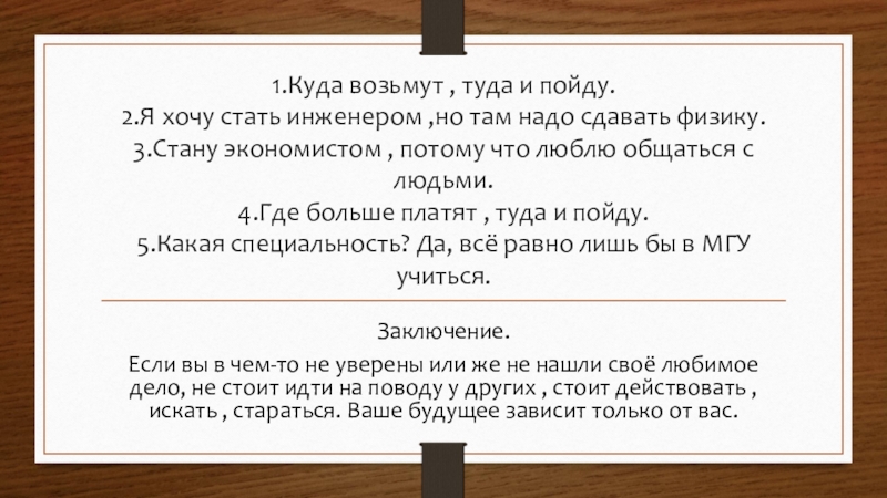 Если вы в чем-то не уверены или же не нашли своё любимое дело, не стоит идти на поводу у других , стоит действовать , искать , стараться. Ваше будущее зависит только от вас.