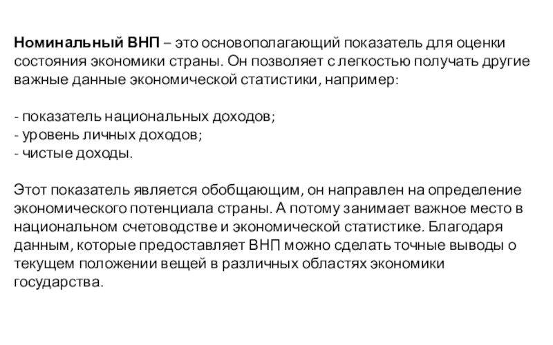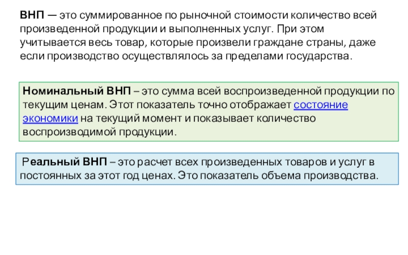 Номинальный ВНП – это сумма всей воспроизведенной продукции по текущим ценам. Этот показатель точно отображает состояние экономики на текущий момент и показывает количество воспроизводимой продукции.