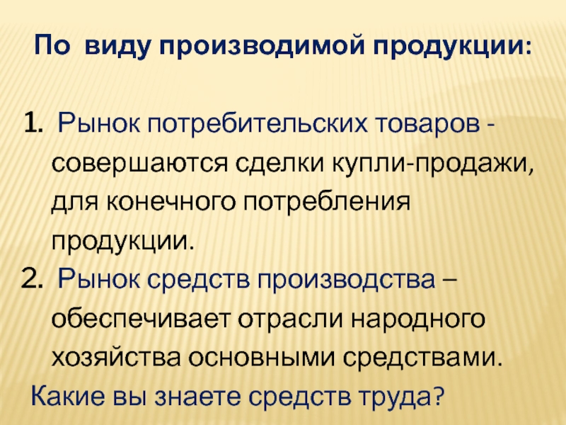 Рынок средств производства – обеспечивает отрасли народного хозяйства основными средствами.