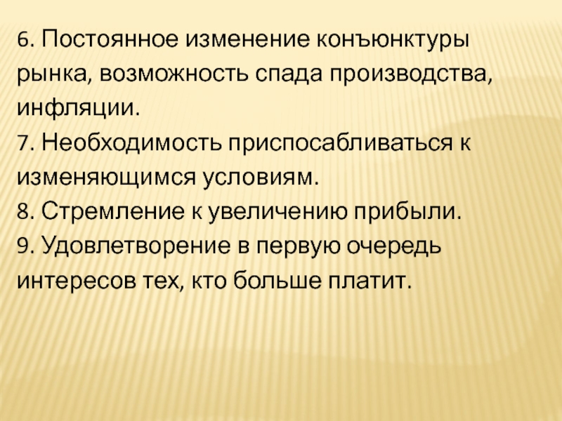Слайд 186. Постоянное изменение конъюнктуры рынка, возможность спада производства, инфляции.