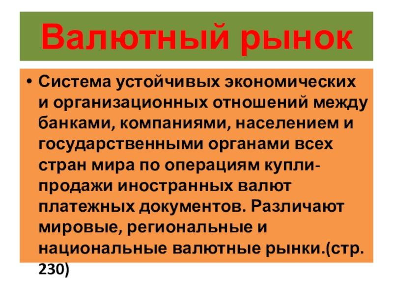 и государственными органами всех стран мира по операциям купли-продажи иностранных валют платежных документов. Различают мировые, региональные и национальные валютные рынки.(стр. 230)