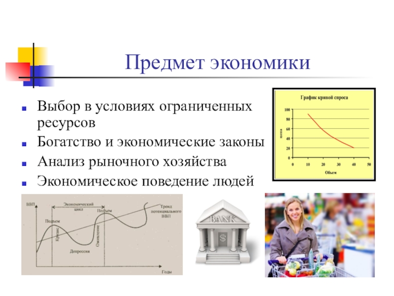 Предмет экономикиВыбор в условиях ограниченных ресурсовБогатство и экономические законыАнализ рыночного хозяйстваЭкономическое поведение людей