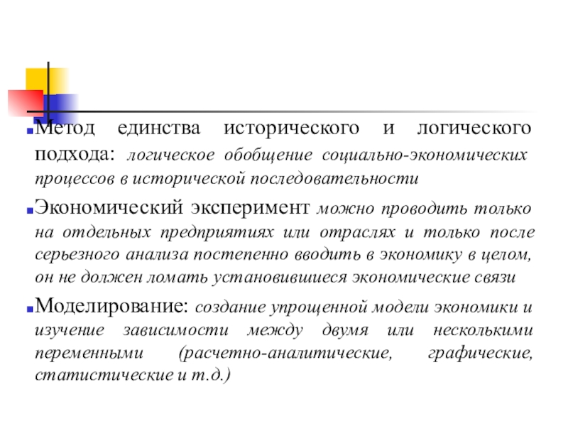 Метод единства исторического и логического подхода: логическое обобщение социально-экономических процессов в исторической последовательностиЭкономический эксперимент можно проводить только