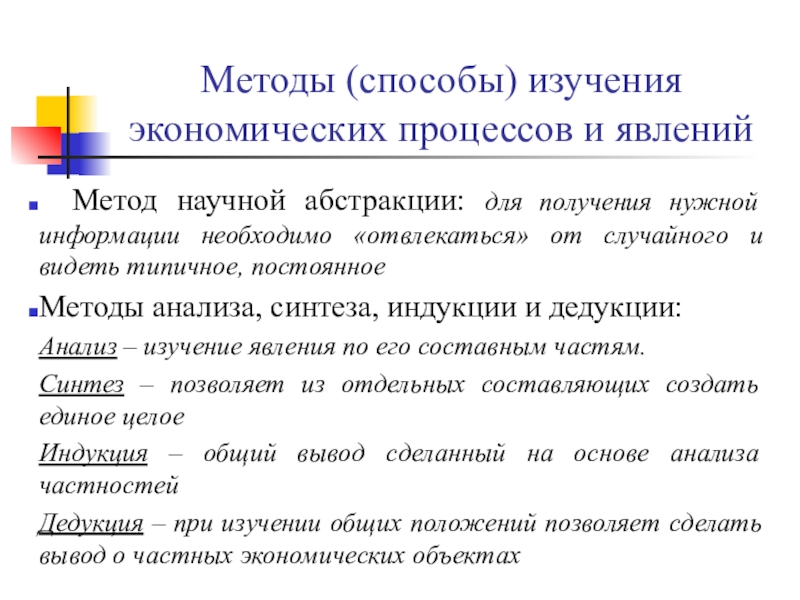 Методы (способы) изучения экономических процессов и явлений Метод научной абстракции: для получения нужной информации необходимо «отвлекаться» от