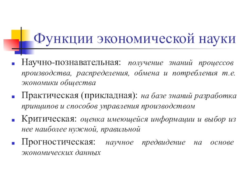 Функции экономической наукиНаучно-познавательная: получение знаний процессов производства, распределения, обмена и потребления т.е. экономики обществаПрактическая (прикладная): на базе