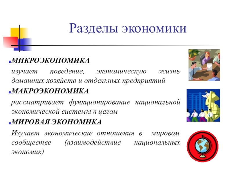 Разделы экономикиМИКРОЭКОНОМИКАизучает поведение, экономическую жизнь домашних хозяйств и отдельных предприятийМАКРОЭКОНОМИКАрассматривает функционирование национальной экономической системы в целомМИРОВАЯ ЭКОНОМИКАИзучает
