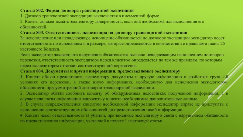 Слайд 23Статья 802. Форма договора транспортной экспедиции