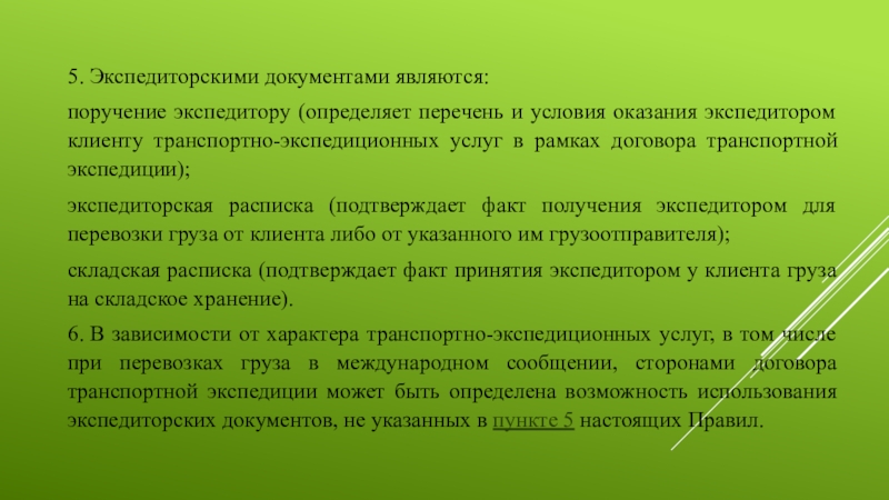6. В зависимости от характера транспортно-экспедиционных услуг, в том числе при перевозках груза в международном сообщении, сторонами договора транспортной экспедиции может быть определена возможность использования экспедиторских документов, не указанных в пункте 5 настоящих Правил.