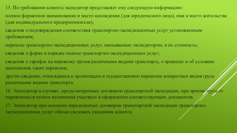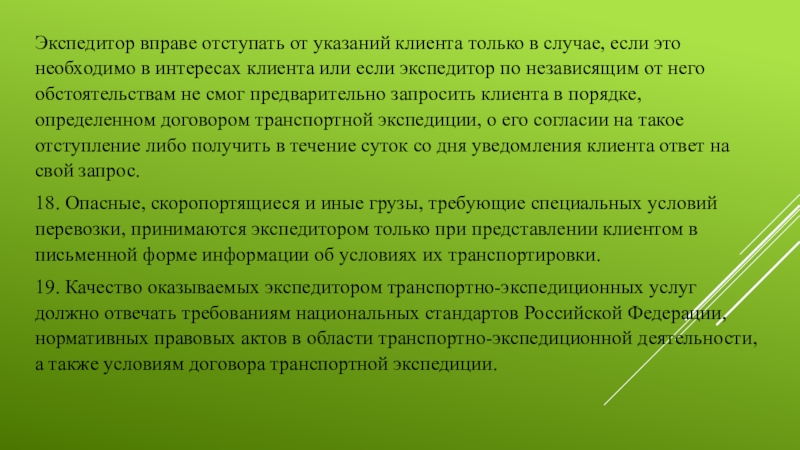 17. Экспедитор при оказании определенных договором транспортной экспедиции транспортно-экспедиционных услуг обязан следовать указаниям клиента.