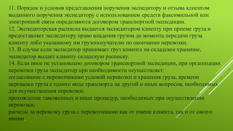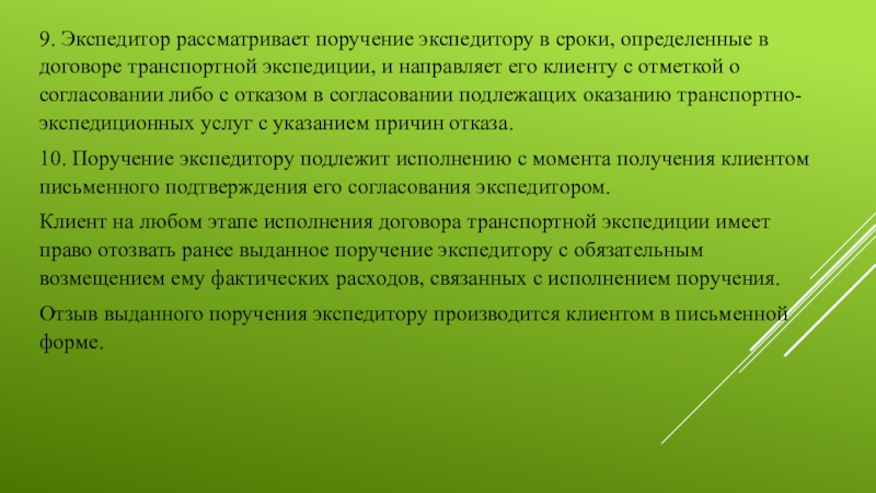 Слайд 329. Экспедитор рассматривает поручение экспедитору в сроки, определенные в договоре транспортной экспедиции,