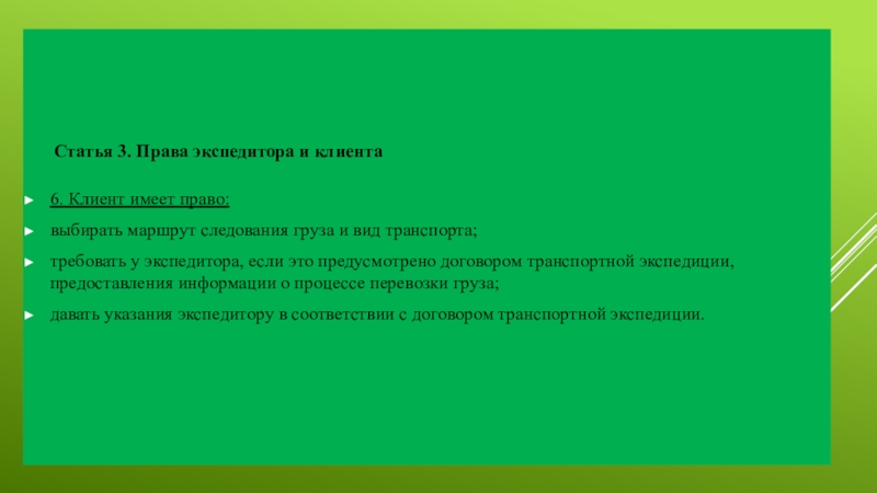 Слайд 35Экспедитор вправе отступать от указаний клиента только в случае, если это