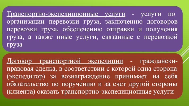 1. По договору транспортной экспедиции одна сторона (экспедитор) обязуется за вознаграждение и за счет другой стороны (клиента-грузоотправителя или грузополучателя) выполнить или организовать выполнение определенных договором экспедиции услуг, связанных с перевозкой груза.