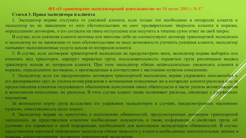 ФЗ «О транспортно-экспедиторской деятельности» от 30 июня 2003 г. N 87