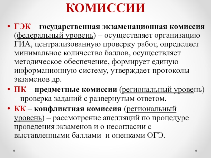 КК – конфликтная комиссия (региональный уровень) – рассмотрение апелляций по процедуре проведения экзаменов и о несогласии с выставленными баллами и оценками ОГЭ.