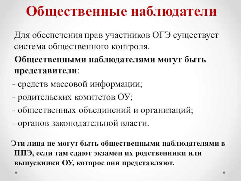 Эти лица не могут быть общественными наблюдателями в ППЭ, если там сдают экзамен их родственники или выпускники ОУ, которое они представляют.