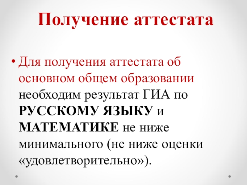 по РУССКОМУ ЯЗЫКУ и МАТЕМАТИКЕ не ниже минимального (не ниже оценки «удовлетворительно»).