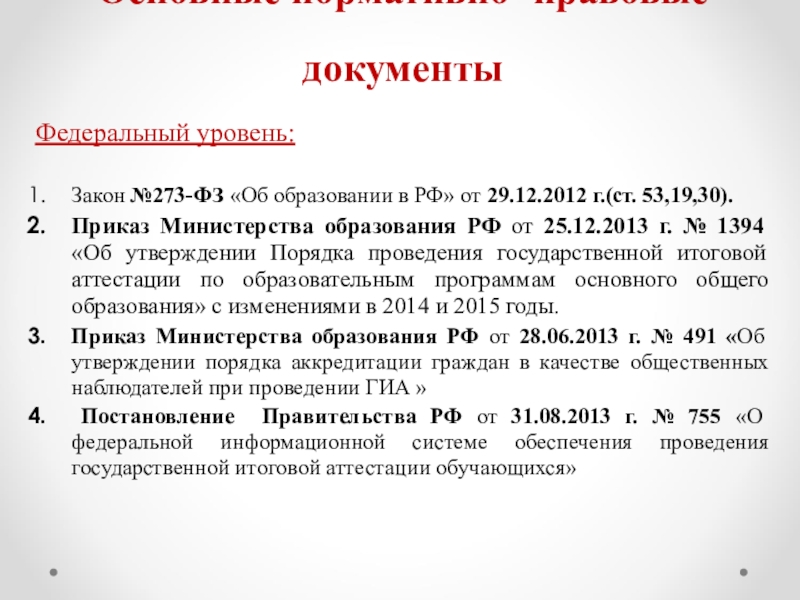 Приказ Министерства образования РФ от 25.12.2013 г. № 1394 «Об утверждении Порядка проведения государственной итоговой аттестации по образовательным программам основного общего образования» с изменениями в 2014 и 2015 годы.