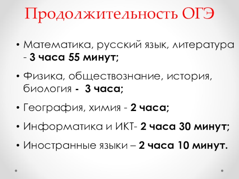 Продолжительность экзаменов от 2 часов до 3 часов 55 минут.