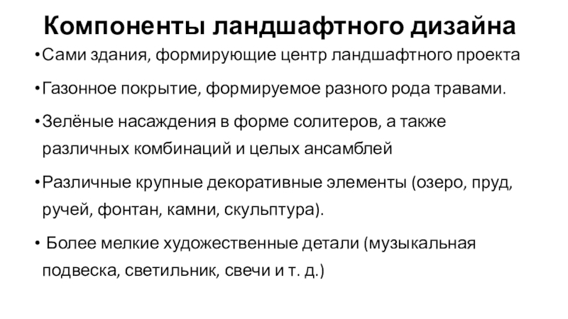 Слайд 4Компоненты ландшафтного дизайна