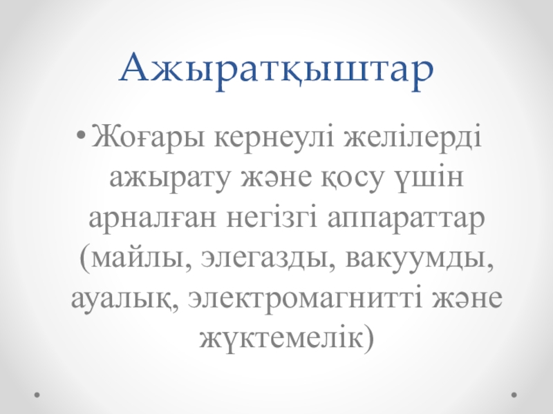 АжыратқыштарЖоғары кернеулі желілерді ажырату және қосу үшін арналған негізгі аппараттар (майлы, элегазды, вакуумды, ауалық, электромагнитті және жүктемелік)