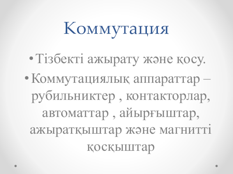 КоммутацияТізбекті ажырату және қосу.Коммутациялық аппараттар – рубильниктер , контакторлар, автоматтар , айырғыштар, ажыратқыштар және магнитті қосқыштар