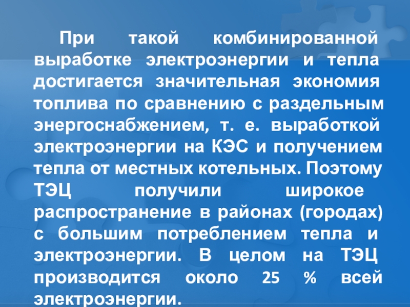 по сравнению с раздельным энергоснабжением, т. е. выработкой электроэнергии на КЭС и получением тепла от местных котельных. Поэтому ТЭЦ получили широкое распространение в районах (городах) с большим потреблением тепла и электроэнергии. В целом на ТЭЦ производится около 25 % всей электроэнергии.