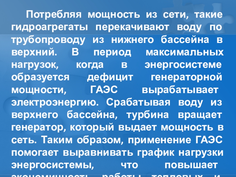 нижнего бассейна в верхний. В период максимальных нагрузок, когда в энергосистеме образуется дефицит генераторной мощности, ГАЭС вырабатывает электроэнергию. Срабатывая воду из верхнего бассейна, турбина вращает генератор, который выдает мощность в сеть. Таким образом, применение ГАЭС помогает выравнивать график нагрузки энергосистемы, что повышает экономичность работы тепловых и атомных электростанций.