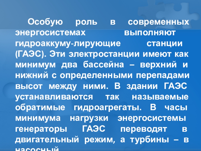 Особую роль в современных энергосистемах выполняют гидроаккуму-лирующие станции (ГАЭС). Эти электростанции