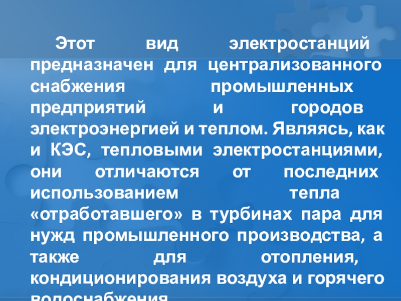 электроэнергией и теплом. Являясь, как и КЭС, тепловыми электростанциями, они отличаются от последних использованием тепла «отработавшего» в турбинах пара для нужд промышленного производства, а также для отопления, кондиционирования воздуха и горячего водоснабжения.
