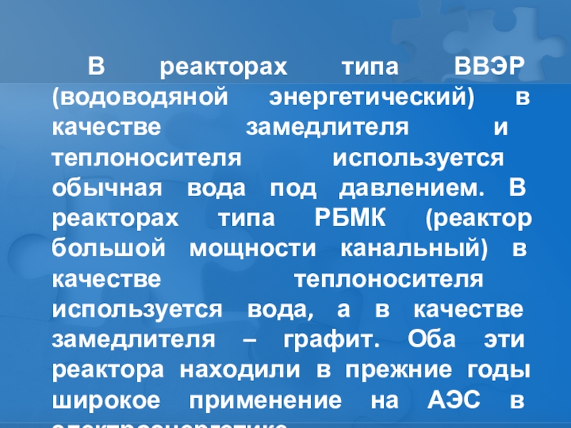 используется обычная вода под давлением. В реакторах типа РБМК (реактор большой мощности канальный) в качестве теплоносителя используется вода, а в качестве замедлителя – графит. Оба эти реактора находили в прежние годы широкое применение на АЭС в электроэнергетике.