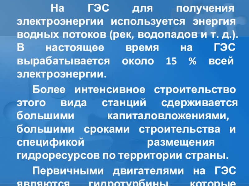 водопадов и т. д.). В настоящее время на ГЭС вырабатывается около 15 % всей электроэнергии.
