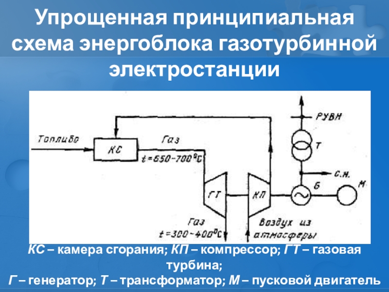 Слайд 14Упрощенная принципиальная схема энергоблока газотурбинной электростанции