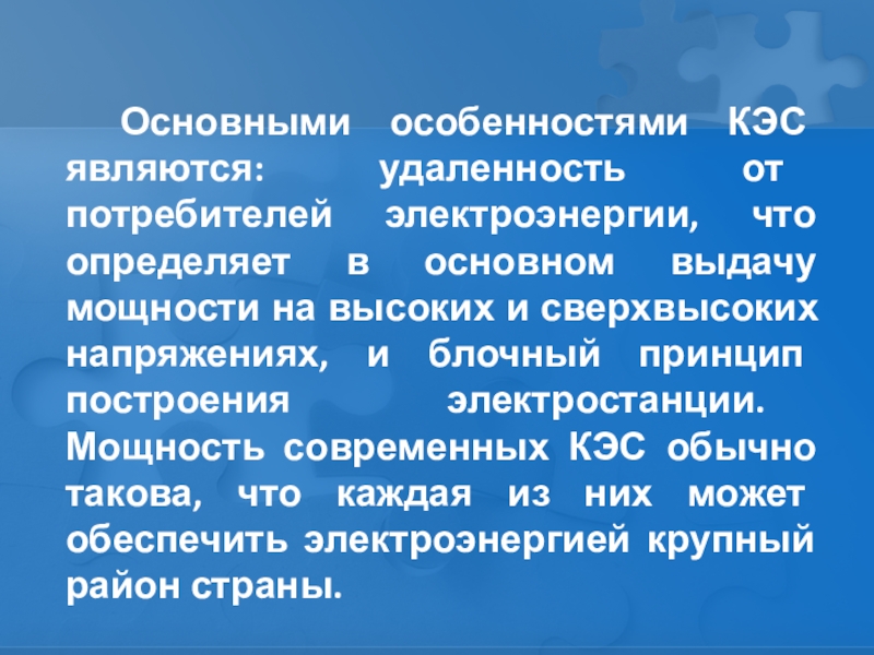 основном выдачу мощности на высоких и сверхвысоких напряжениях, и блочный принцип построения электростанции. Мощность современных КЭС обычно такова, что каждая из них может обеспечить электроэнергией крупный район страны.