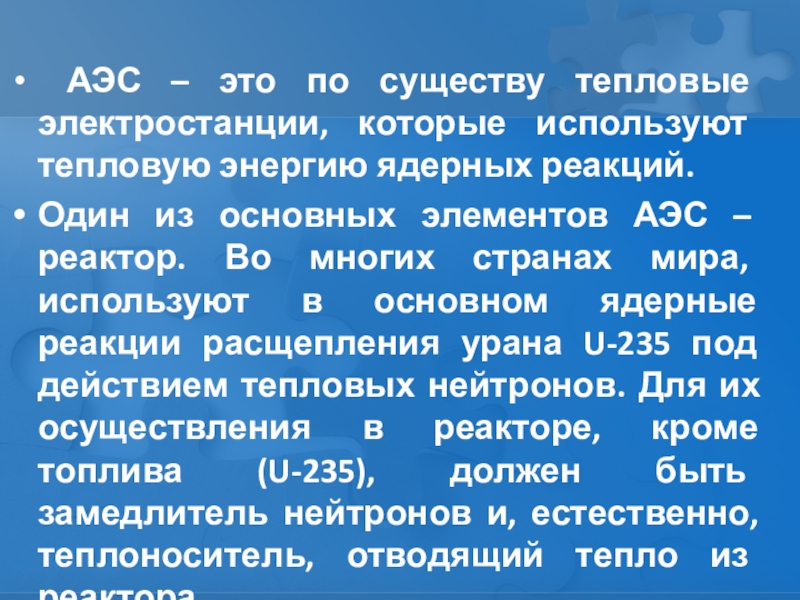 Один из основных элементов АЭС – реактор. Во многих странах мира, используют в основном ядерные реакции расщепления урана U-235 под действием тепловых нейтронов. Для их осуществления в реакторе, кроме топлива (U-235), должен быть замедлитель нейтронов и, естественно, теплоноситель, отводящий тепло из реактора.
