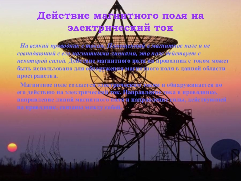 Помещенный в магнитное поле и не совпадающий с его магнитными линиями, это поле действует с некоторой силой. Действие магнитного поля на проводник с током может быть использовано для обнаружения магнитного поля в данной области пространства.