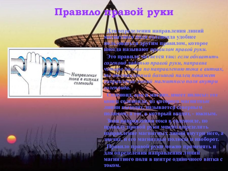 Зная направления тока в соленоиде, по правилу правой руки можно определить направление магнитных линий внутри него, а значит, и его магнитные полюсы и наоборот.