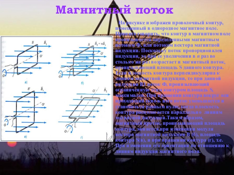 Принято говорить, что контур в магнитном поле пронизывается определенными магнитным потоком Ф, или потоком вектора магнитной индукции. Поскольку поток пропорционален индукции, то при ее увеличении в п раз во столько же раз возрастает и магнитный поток, пронизывающий площадь S данного контура. Если плоскость контура перпендикулярна к линиям магнитной индукции, то при данной индукции В1 поток Ф, пронизывающий ограниченную этим контуром площадь S, максимален. При вращении контура вокруг оси проходящий сквозь него поток уменьшается и становиться равным нулю, когда плоскость контура располагается параллельно линиям магнитной индукции.Таким образом, магнитный проток, пронизывающий площадь контура, меняется при изменении модуля вектора магнитной индукции В (б), площадь контура S(в), и при вращении контура (г), т.е. При изменении его ориентации по отношению к линиям индукции магнитного поля.