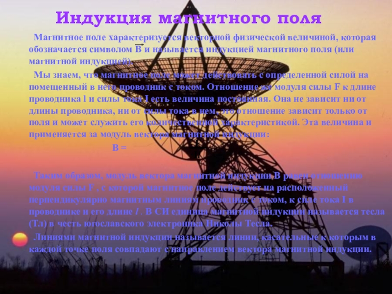 Таким образом, модуль вектора магнитной индукции В равен отношению модуля силы F , с которой магнитное поле действует на расположенный перпендикулярно магнитным линиям проводник с током, к силе тока I в проводнике и его длине l . В СИ единица магнитной индукции называется тесла (Тл) в честь югославского электроника Николы Тесла.