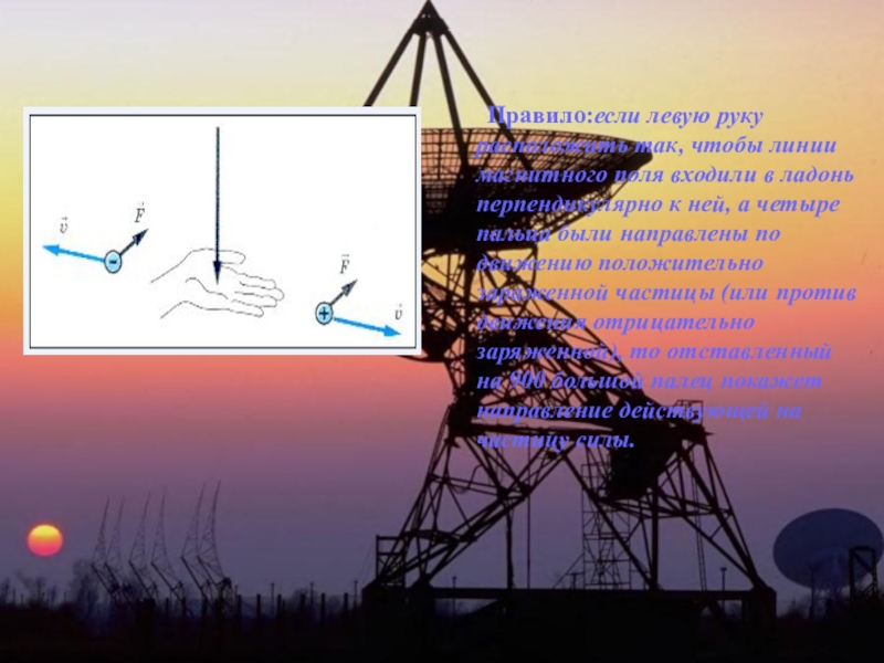 ладонь перпендикулярно к ней, а четыре пальца были направлены по движению положительно зараженной частицы (или против движения отрицательно заряженной), то отставленный на 900 большой палец покажет направление действующей на частицу силы.