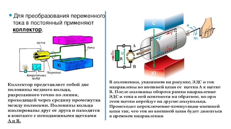 В положении, указанном на рисунке, ЭДС и ток направлены во внешней цепи от щетки А к щетке В. После половины оборота рамки направление ЭДС и тока в ней изменится на обратное, но при этом щетки перейдут на другие полукольца. Происходит переключение-коммутация-внешней цепи так, что ток во внешней цепи будет двигаться в прежнем направлении