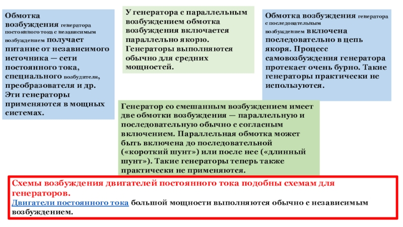 Генератор со смешанным возбуждением имеет две обмотки возбуждения — параллельную и последовательную обычно с согласным включением. Параллельная обмотка может быть включена до последовательной («короткий шунт») или после нее («длинный шунт»). Такие генераторы теперь также практически не применяются.