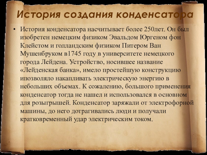физиком Эвальдом Юргеном фон Клейстом и голландским физиком Питером Ван Мушенбруком в1745 году в университете немецкого города Лейдена. Устройство, носившее название «Лейденская банка», имело простейшую конструкцию ипозволяло накапливать электрическую энергию в небольших объемах. К сожалению, большого применения конденсатор тогда не нашел и использовался в основном для розыгрышей. Конденсатор заряжали от электрофорной машины, до него дотрагивались люди и получали кратковременный удар электрическим током.