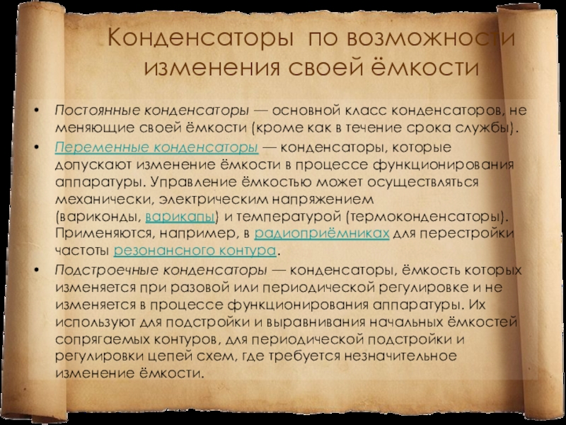Слайд 15Конденсаторы по возможности изменения своей ёмкости