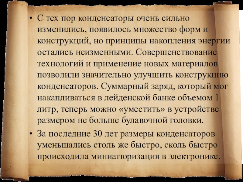 конструкций, но принципы накопления энергии остались неизменными. Совершенствование технологий и применение новых материалов позволили значительно улучшить конструкцию конденсаторов. Суммарный заряд, который мог накапливаться в лейденской банке объемом 1 литр, теперь можно «уместить» в устройстве размером не больше булавочной головки.