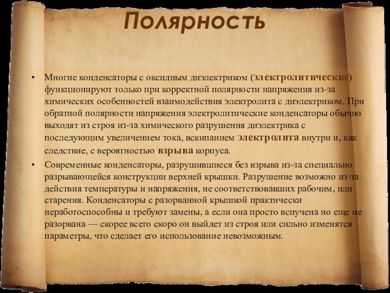 напряжения из-за химических особенностей взаимодействия электролита с диэлектриком. При обратной полярности напряжения электролитические конденсаторы обычно выходят из строя из-за химического разрушения диэлектрика с последующим увеличением тока, вскипанием электролита внутри и, как следствие, с вероятностью взрыва корпуса.