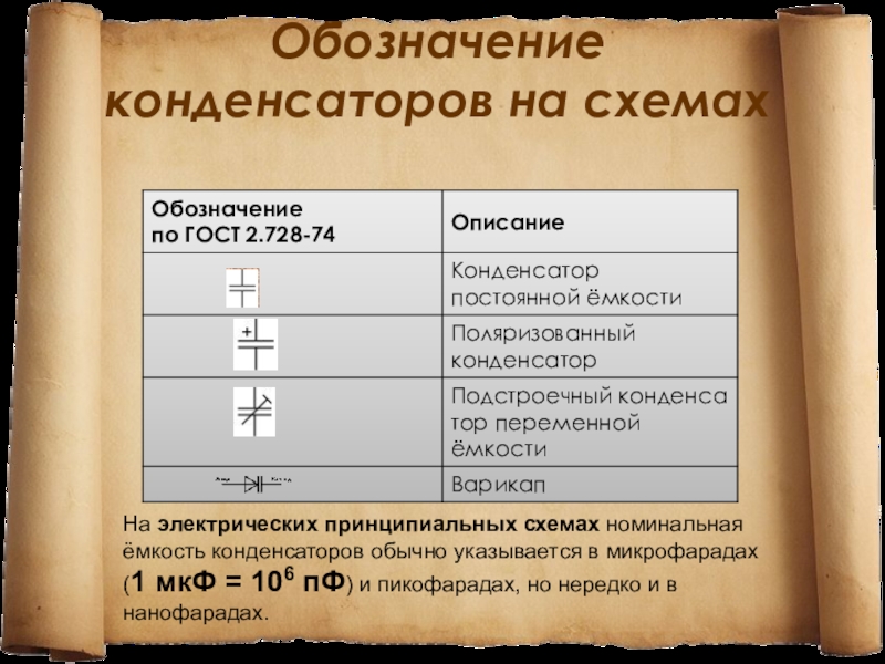 На электрических принципиальных схемах номинальная ёмкость конденсаторов обычно указывается в микрофарадах